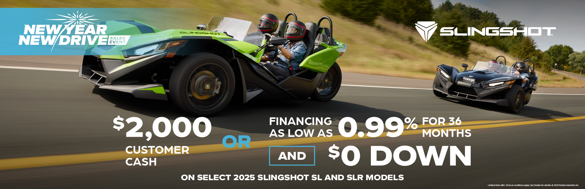 This is a limited time offer which consists of $2,000 Customer Cash rebate towards the purchase of new model year 2025 SL and SLR Slingshots. This offer is subject to change and may be extended or terminated without further notice. Offer may not be combined with promotional financing on Slingshot SL or SLR models. All rebates paid to dealer and are not redeemable for cash. The $2,000 customer cash offer is specific to 2025 Slingshot SL or SLR models. Offer Valid: January 1 – 31, 2026.